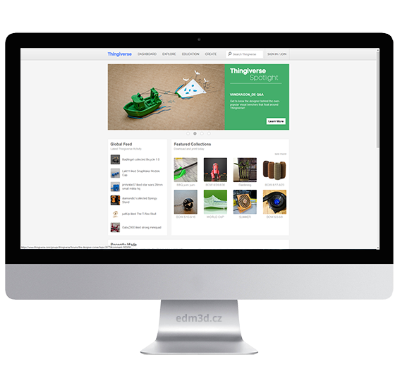 Thingiverse je prosperující komunita MakerBot pro objevování, vytváření a sdílení 3D tiskovin. Jako největší světová společnost zabývající se 3D tiskem, věříme, že každý by měl být povzbuzován k vytváření a remixování 3D věcí bez ohledu na jejich odborné znalosti nebo předchozí zkušenosti. V duchu udržování otevřené platformy se doporučuje, aby všechny návrhy byly licencovány na základě licence Creative Commons, což znamená, že každý může použít nebo změnit jakýkoli design. Společnost Thingiverse nahrála více než 1.102.360 3D modelů a toto číslo se každým dnem rozrůstá. Podívejte se na všechny neuvěřitelné objekty, které lidé vytvořili, a nechte se inspirovat, abyste vytvořili vlastní!
