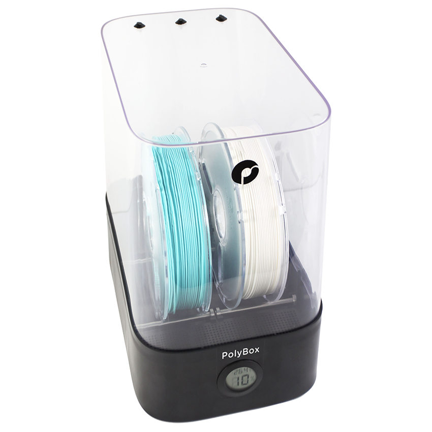 Působení okolního prostředí, především prachu či vzdušné vlhkosti, vede až k degradaci řady tiskových materiálů. Ty pak pozbývají své mechanické vlastnosti i snadnou tisknutelnost. Skladovací úložiště PolyBox uchová materiál v optimálním prostředí, o kterém vás budou informovat přesný teploměr s vlhkoměrem. Součástí je absorbent nadbytečné vlhkosti, který se bude hodit speciálně u vysoce nasákavých materiálů PolySmooth, PVA či u Nylonu.